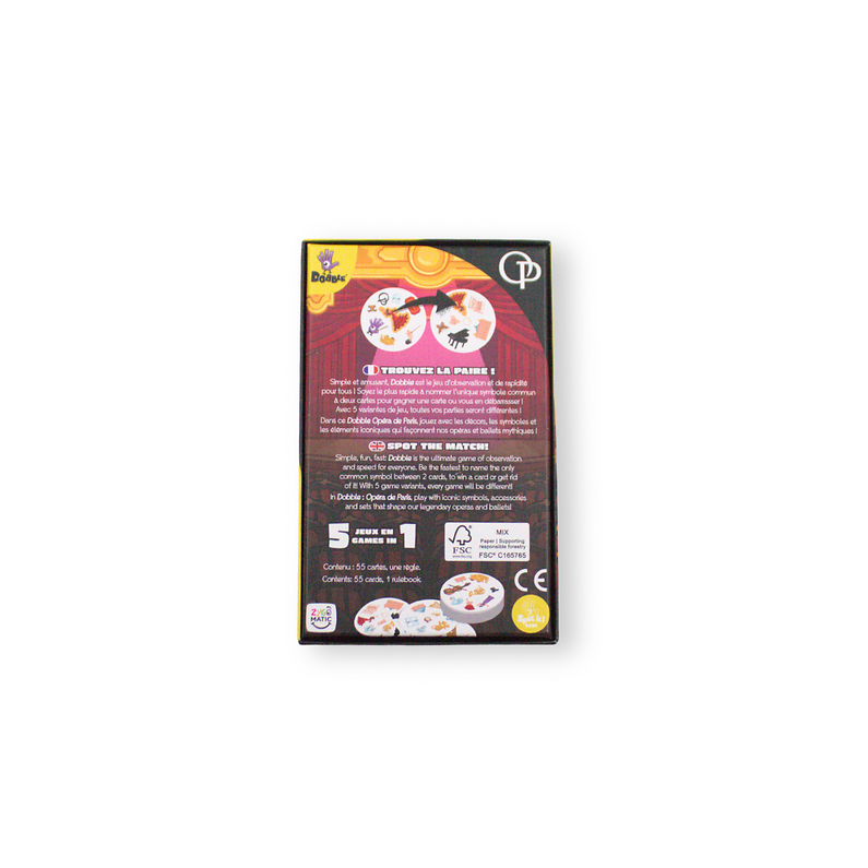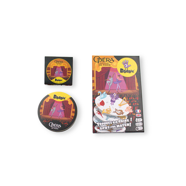 Discover the Dobble Opera board game. Simple and fun, Dobble is the ultimate observation and speed game! Be the fastest to spot the common symbol between two cards to win or get rid of a card. With 5 game variants, each round is different! This special Paris Opera edition features the iconic sets, symbols, and elements from our legendary operas and ballets.