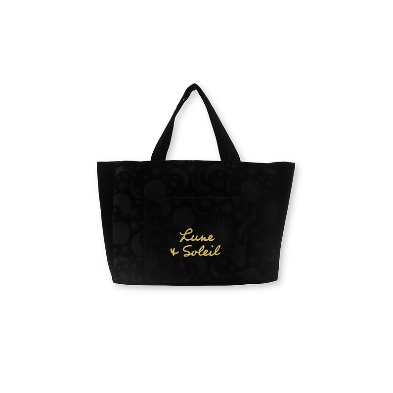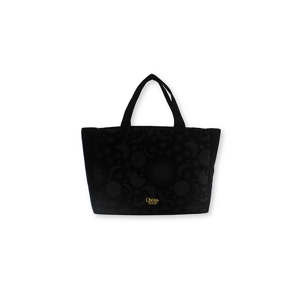 Combining elegance and practicality, this black and gold tote bag with a Moon & Sun motif is ideal for everyday use. Its soft velvet, generous size, and front pocket make it an accessory that is as functional as it is refined. Official Opera Product.