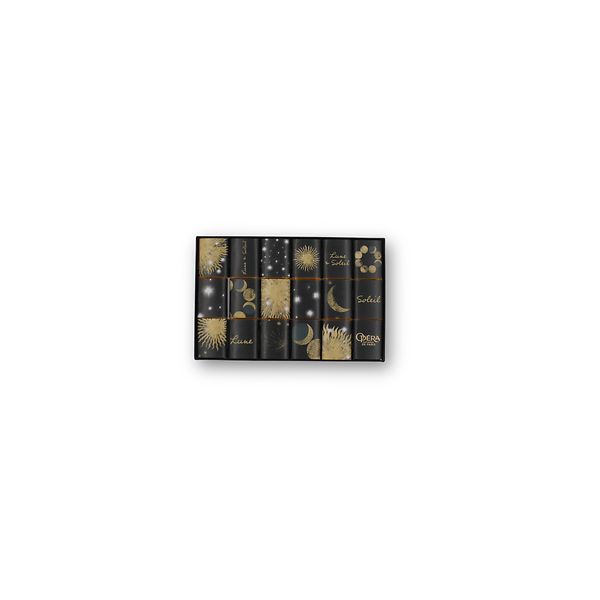 Élégant et raffiné, ce coffret est parfait pour offrir ou se faire plaisir. Chaque tablette est emballée individuellement, garantissant fraîcheur et praticité. Le motif Lune et Soleil apporte une touche artistique et distinguée à ce délice gourmand.